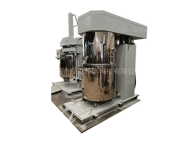行星分散攪拌機有高速、低速、活動刮板作攪拌、剪切、刮壁、溶解用。低速運轉的攪拌錨使物料在密閉容器內上下翻動、剪切和混合,高速運轉的齒形分散盤與混合的物料產生強烈的碰擊和剪切,隨著攪拌錨的旋轉,行星架上的活動刮刀隨著旋轉,把釜體上的物料完全刮掉,使聚集物完全、徹底地達到混合、分散、溶解的要求。在其高低速的不同作用下,使物料能夠達到均勻的混合和分散。